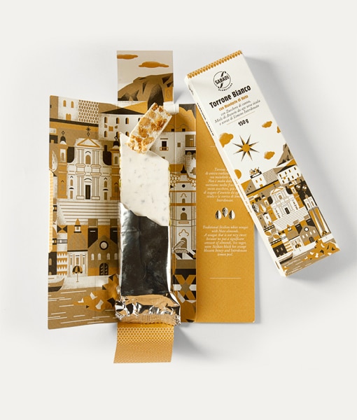 A nougat that is not very sweet because we put a significant amount of almonds, less sugar, more Sicilian black bee orange blossom honey and Interdonato lemon peel.